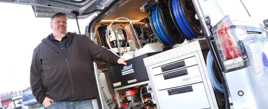 Ronny Arnevik er daglig leder i nyoppstartede VA Rørteknikk, og sammen med arbeidende styreleder Johannes Thomsen har de gått til innkjøp av en Mercedes-Benz Vito, og rigget den for jobbene de tilbyr; tredjepartskontroll med trykktesting og desinfisering av vannledninger.
